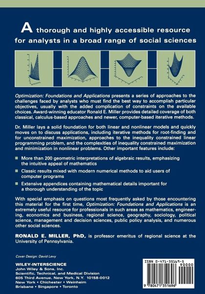 A thorough and highly accessible resource for analysts in a broad range of social sciences. Optimization: Foundations and Applications presents a series of approaches to the challenges faced by analysts who must find the best way to accomplish particular objectives, usually with the added complication of constraints on the available choices. Award-winning educator Ronald E. Miller provides detailed coverage of both classical, calculus-based approaches and newer, computer-based iterative methods. Dr. Miller lays a solid foundation for both linear and nonlinear models and quickly moves on to discuss applications, including iterative methods for root-finding and for unconstrained maximization, approaches to the inequality constrained linear programming problem, and the complexities of inequality constrained maximization and minimization in nonlinear problems. Other important features include: * More than 200 geometric interpretations of algebraic results, emphasizing the intuitive appeal of mathematics * Classic results mixed with modern numerical methods to aid users of computer programs * Extensive appendices containing mathematical details important for a thorough understanding of the topic With special emphasis on questions most frequently asked by those encountering this material for the first time, Optimization: Foundations and Applications is an extremely useful resource for professionals in such areas as mathematics, engineering, economics and business, regional science, geography, sociology, political science, management and decision sciences, public policy analysis, and numerous other social sciences.