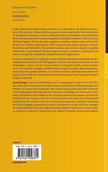 Kenneth Lange is the Rosenfeld Professor of Computational Genetics at UCLA. He is also Chair of the Department of Human Genetics and Professor of Biomathematics and Statistics. At various times during his career, he has held appointments at the University of New Hampshire, MIT, Harvard, the University of Michigan, the University of Helsinki, and Stanford. He is a fellow of the American Statistical Association, the Institute of Mathematical Statistics, and the American Institute for Medical and Biomedical Engineering. His research interests include human genetics, population modeling, biomedical imaging, computational statistics, and applied stochastic processes. Springer previously published his books Mathematical and Statistical Methods for Genetic Analysis, Numerical Analysis for Statisticians, and Applied Probability, all in second editions.