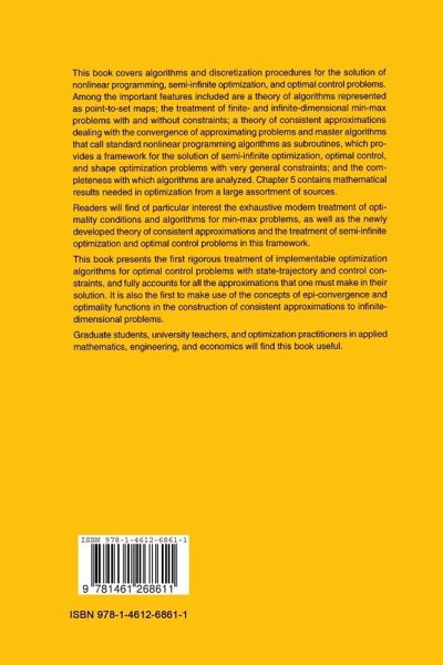 This book deals with optimality conditions, algorithms, and discretization tech niques for nonlinear programming, semi-infinite optimization, and optimal con trol problems. The unifying thread in the presentation consists of an abstract theory, within which optimality conditions are expressed in the form of zeros of optimality junctions, algorithms are characterized by point-to-set iteration maps, and all the numerical approximations required in the solution of semi-infinite optimization and optimal control problems are treated within the context of con sistent approximations and algorithm implementation techniques. Traditionally, necessary optimality conditions for optimization problems are presented in Lagrange, F. John, or Karush-Kuhn-Tucker multiplier forms, with gradients used for smooth problems and subgradients for nonsmooth prob lems. We present these classical optimality conditions and show that they are satisfied at a point if and only if this point is a zero of an upper semicontinuous optimality junction. The use of optimality functions has several advantages. First, optimality functions can be used in an abstract study of optimization algo rithms. Second, many optimization algorithms can be shown to use search directions that are obtained in evaluating optimality functions, thus establishing a clear relationship between optimality conditions and algorithms. Third, estab lishing optimality conditions for highly complex problems, such as optimal con trol problems with control and trajectory constraints, is much easier in terms of optimality functions than in the classical manner. In addition, the relationship between optimality conditions for finite-dimensional problems and semi-infinite optimization and optimal control problems becomestransparent.