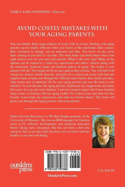 You can handle those large projects at work with no sweat. Dealing with aging parents can be totally different when you factor in the emotional roller coaster, their resistance to change, and an unknown end date. You won't see the curve balls coming at you until it's too late. This book helps you think about what is the right answer for your parents and you now. What is the next step? Many of the options can be expensive. I share my experiences and others' choices along with the emotional, financial, legal, and medical aspects of aging. The reality is your parents will die. This might not be an easy path as they decline. You will deal with doctors, funerals, death, and grief. It is critical you create a life line and support team to help you through the difficult times before their death and after. As you become the aging parents, implement my suggestions and make life easier for your children and you. This book will guide you through the challenges of managing care for your aging parents.
