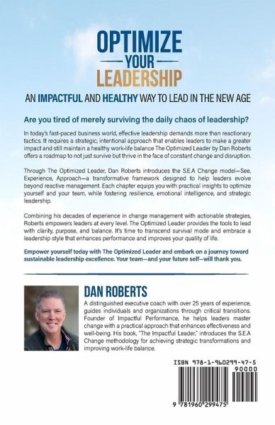 Are you tired of merely surviving the daily chaos of leadership? In today's fast-paced business world, effective leadership demands more than reactionary tactics-it requires a strategic, intentional approach. The Optimized Leader by Dan Roberts offers a roadmap to not just survive but thrive in the face of constant change and disruption. Through The Optimized Leader, Dan Roberts introduces the S.E.A Change model-See, Experience, Approach-a transformative framework designed to help leaders evolve beyond reactive management. Each chapter equips you with practical insights to optimize yourself and your team, while fostering resilience, emotional intelligence, and strategic leadership. From mastering influence to cultivating an optimized team culture, Roberts combines his decades of experience in change management with actionable strategies to empower leaders at every level. Whether you're a seasoned executive navigating organizational shifts or an emerging leader striving for impact, The Optimized Leader provides the tools to lead with clarity, purpose, and balance. It's time to transcend survival mode and embrace a leadership style that enhances performance and improves your quality of life. Empower yourself today with The Optimized Leader and embark on a journey toward sustainable leadership excellence. Your team-and your future self-will thank you. Dan Roberts is a distinguished executive leadership coach and consultant renowned for steering individuals and organizations through pivotal transitions and strategic enhancements. With a robust career spanning over 25 years, Dan has emerged as a trusted advisor in transformational change, collaborating with various companies-from nimble startups to Fortune 100 giants. His later corporate years were marked by his work in developing agile change programs tailored for some of the world's leading companies. Recognizing a greater calling in leadership optimization, Dan founded Impactful Performance. This venture was born from his passion to empower leaders to master the art of navigating and implementing change that benefits them and their teams. His approach is highly praised for its practicality and relevance, helping clients overcome stagnation and enhance both their leadership effectiveness and personal well-being.