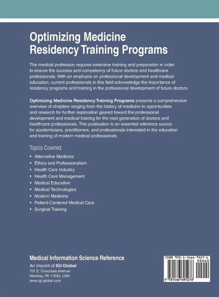 The medical profession requires extensive training and preparation in order to ensure the success and competency of future doctors and healthcare professionals. With an emphasis on professional development and medical education, current professionals in this field acknowledge the importance of residency programs and training in the professional development of future doctors. Optimizing Medicine Residency Training Programs presents a comprehensive overview of chapters ranging from the history of medicine to opportunities and research for further exploration geared toward the professional development and medical training for the next generation of doctors and healthcare professionals. This publication is an essential reference source for academicians, practitioners, and professionals interested in the education and training of modern medical professionals.