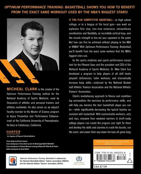 An easy-to-use fitness assessment guide and personalized workout to dramatically increase anyone's basketball skills. Micheal Clark virtually wrote the book that personal trainers all over the country use to gain their certification in the field. As creator of the Optimum Performance Training system, he took personal training to a whole new level by introducing a program that could be fully customized for any sport. In this book, Clark will enable readers through his "self-assessment and design fitness system" to effectively pinpoint the weaknesses in their basketball skills and tailor a workout program that will improve on all the flaws in their game. By taking advantage of skill-specific tests, readers will be able to focus their workout time on the area they most need and will see quick results. This user-friendly guide begins with a simple five-step assessment to help you realize what your game lacks. Whether you want explosiveness off the first step like Lebron James, the iron-man endurance of Steve Nash, the coordination and flexibility of Kevin Garnett, the vertical leap of Vince Carter, or the muscle strength of Amare Stoudemire, you'll pinpoint your deficiencies and benefit from the exact same workout that Clark uses for the NBA's biggest stars. Clark's revolutionary approach to fitness and conditioning personalizes the workouts not only by sport, but also by performance skills, and will help you become the best basketball player you can be. With customizable workouts, sets, and reps, everyone from basketball fanatics to weekend warriors can find the program just right for them, and get the extra skills to crash the boards, run the court, and power their way down the lane for all four quarters.