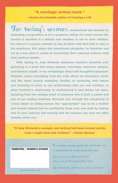 For contemporary women, motherhood has become as polarizing a proposition as it is a powerful calling. For some women this tension is manifest in a debate over whether or not to have children. For others it concerns whether to stay at home with their children or stay in the workforce. Still others feel abandoned altogether by the supposedly pro-family and pro-mother social justice movement that is feminism and are at a loss when it comes to reconciling their maternal instincts with their political beliefs. With Opting In, Amy Richards addresses the anxiety over parenting that women face today in a book that mixes memoir, interviews, historical analysis, and feminist insight. In her refreshingly direct and thoughtful approach, Richards covers everything from the truth about our biological clocks and the trends toward extending fertility, to parenting with nature and nurturing in mind, to our relationship with our own mothers, to what feminism's relationship to motherhood is and always has been. Speaking from the vantage point of someone who is both a parent and one of our leading feminist activists, Richards cuts through the cacophony of voices intent on telling women the "appropriate" way to be a mother and reveals instead how to confidently forge your own path while staying true to yourself and your ideals.