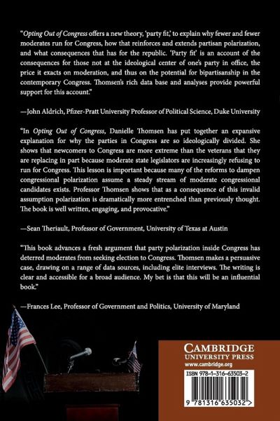 "This book provides a candidate entry explanation for partisan polarization in Congress. Danielle M. Thomsen draws on quantitative data to show that ideological moderates are less likely to run for and remain in Congress than those at the extremes. The book introduces a party fit argument for why moderates have opted out of congressional politics. It suggests that the personal and professional benefits of congressional service have diminished for liberal Republicans and conservative Democrats as the parties have drifted apart. Although the political center has long been deemed a coveted position in the legislature, it is now a lonely and lowly place to be. Opting Out of Congress argues that partisan polarization is unlikely to diminish if ideological moderates do not run for office, and reformers who seek to restore bipartisanship in Congress must consider how to encourage moderates to launch congressional candidacies."--]cProvided by publisher.