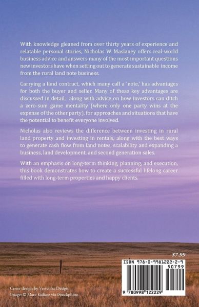 With knowledge gleaned from over thirty years of experience and relatable personal stories, Nicholas W. Maslaney offers real-world business advice and answers many of the most important questions new investors have when setting out to generate sustainable income from the rural land note business. Carrying a land contract, which many call a 'note,' has advantages for both the buyer and seller. Many of these key advantages are discussed in detail, along with advice on how investors can ditch a zero-sum game mentality (where only one party wins at the expense of the other party), for approaches and situations that have the potential to benefit everyone involved. Nicholas also reviews the difference between investing in rural land property and investing in rentals, along with the best ways to generate cash flow from land notes, scalability and expanding a business, land development, and second generation sales. With an emphasis on long-term thinking, planning, and execution, this book demonstrates how to create a successful lifelong career filled with long-term properties and happy clients.