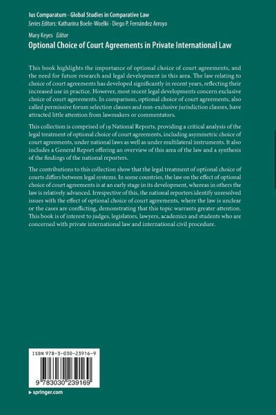 This collection is comprised of 19 National Reports, providing a critical analysis of the legal treatment of optional choice of court agreements, including asymmetric choice of court agreements, under national laws as well as under multilateral instruments. It also includes a General Report offering an overview of this area of the law and a synthesis of the findings of the national reporters.