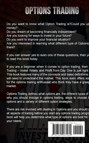 Do you want to know what Option Trading is?Could you use extra money? Do you dream of becoming financially independent? Are you looking for ways to invest in your future? Do you want to improve your financial situation? Are you interested in learning what different type of Options are out there? If you can answer yes to even one of these questions, then you need to read this book today. If you are a beginner when it comes to option trading, then Options Trading - Invest Wisely and Profit from Day One is just right for you. This book features many of the concepts and basic definitions that you will need to understand the market. This book even offers something for the options trading enthusiast who think they have a grasp on the market. Options Trading defines what options are, the different types of options, why you should indulge in options trading, steps to choose the right options and a variety of different option strategies.