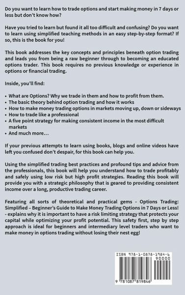 Do you want to start making money trading options, but not sure how to start? Have you tried to learn but found it all too difficult and confusing? Do you want to learn using simplified teaching methods in an easy step-by-step format? If so, this is the book for you! This book addresses the key concepts and principles beneath option trading and leads you from being a raw beginner to becoming an educated options trader. This book requires no previous knowledge or experience in options or financial trading. Inside, you’ll find: What are Options? Why we trade in them and how to profit from them. The basic theory behind option trading and how it works How to make money trading options in markets moving up, down or sideways How to trade like a professional A five point strategy for making consistent income in the most difficult markets And much more… If your previous attempts to learn using books, blogs and online videos have left you confused don’t despair, for this book can help you. Using the simplified trading best practices and profound tips and advice from the professionals, this book will help you understand how to trade profitably and safely using low risk but high profit strategies. Reading this book will provide you with a strategic philosophy that is geared to providing consistent income over a long, productive trading career. Featuring all sorts of theoretical and practical gems - Options Trading Simplified: Beginner’s Guide to Make Money Trading Options in 7 Days or Less! - explains why it is important to have a risk limiting strategy that protects your capital while optimizing your profit potential. This safety first, step by step approach is ideal for beginners and intermediary level traders who want to make money in options trading without losing their nest egg! So scroll up and click "Buy Now" and get started on your 7-day journey to making money trading options!