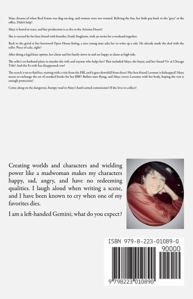 Maye dreams of when Real Estate was dog-eat-dog, and women were not wanted. Reliving the fun, her little pay-back to the "guys" at the office. Didn't help! Maye is bored to tears, and her production is as dry as the Arizona Desert! She is rescued by her best friend with benefits, Frank Singleton, with an invite for a weekend together. Back to the grind at her borrowed Open House listing, a nice young man asks her to write up a sale. He already made the deal with the seller. Piece of cake, right? After doing a legal lease option, her client and his family move in and are happy as clams at high tide. The seller's ex-husband plans to murder the wife and anyone who helps her! That included Maye, the buyer, and her friend Viv at Chicago Title! And the Ex-wife has disappeared, too! The search is on to find her, starting with a visit from the FBI, and it goes downhill from there! Her best friend Lavonne is kidnapped! Maye meets to exchange the set of crooked books for her BBF! Bullets start flying, and Maye covers Lavonne with her body, hoping the vest is enough protection! Come along on the dangerous, bumpy road to Maye's hard-earned commission! If she lives to collect!