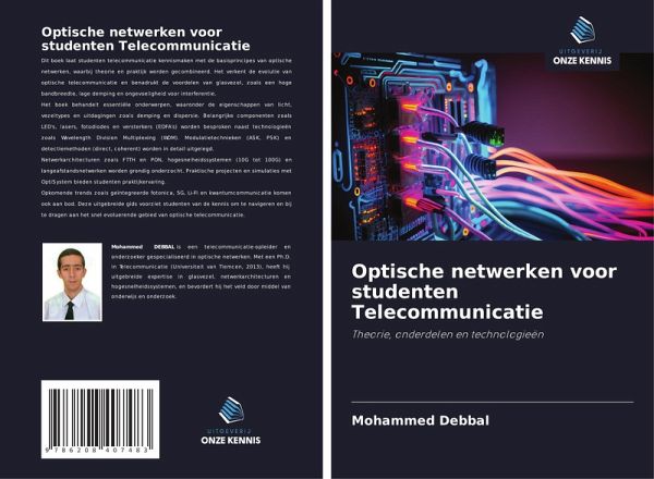 Dit boek laat studenten telecommunicatie kennismaken met de basisprincipes van optische netwerken, waarbij theorie en praktijk worden gecombineerd. Het verkent de evolutie van optische telecommunicatie en benadrukt de voordelen van glasvezel, zoals een hoge bandbreedte, lage demping en ongevoeligheid voor interferentie.Het boek behandelt essentiële onderwerpen, waaronder de eigenschappen van licht, vezeltypes en uitdagingen zoals demping en dispersie. Belangrijke componenten zoals LED's, lasers, fotodiodes en versterkers (EDFA's) worden besproken naast technologieën zoals Wavelength Division Multiplexing (WDM). Modulatietechnieken (ASK, PSK) en detectiemethoden (direct, coherent) worden in detail uitgelegd.Netwerkarchitecturen zoals FTTH en PON, hogesnelheidssystemen (10G tot 100G) en langeafstandsnetwerken worden grondig onderzocht. Praktische projecten en simulaties met OptiSystem bieden studenten praktijkervaring.Opkomende trends zoals geïntegreerde fotonica, 5G, Li-Fi en kwantumcommunicatie komen ook aan bod. Deze uitgebreide gids voorziet studenten van de kennis om te navigeren en bij te dragen aan het snel evoluerende gebied van optische telecommunicatie.