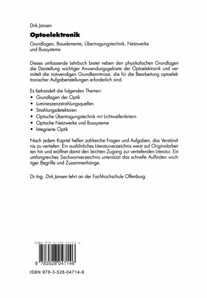 Das Buch behandelt zunächst die Grundlagen der Optik und vermittelt die fundamentalen Kenntnisse strahlungs-physikalischer Größen. Im zweiten Teil werden ausführlich optoelektronische Lichtquellen und Detektoren vorgestellt. Als typische Anwendung der Optoelektronik beschreibt der Autor die Lichtwellenleitertechnik aus optoelektronischer und nachrichtentechnischer Sicht. Die Abschnitte werden durch Zahlenbeispiele, rekapitulierende Fragen und Übungsaufgaben ergänzt. Das Literaturverzeichnis weist auf umfangreiche Spezialliteratur zu jedem Kapitel hin.