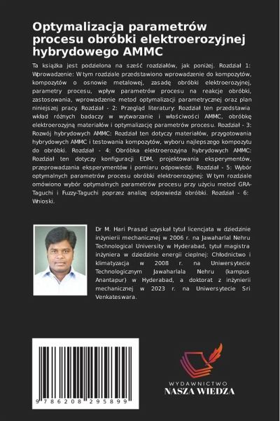 Ta ksi¿¿ka jest podzielona na sze¿¿ rozdziäów, jak poni¿ej. Rozdziä 1: Wprowadzenie: W tym rozdziale przedstawiono wprowadzenie do kompozytów, kompozytów o osnowie metalowej, zasad¿ obróbki elektroerozyjnej, parametry procesu, wp¿yw parametrów procesu na reakcje obróbki, zastosowania, wprowadzenie metod optymalizacji parametrycznej oraz plan niniejszej pracy. Rozdziä - 2: Przegl¿d literatury: Rozdziä ten przedstawia wk¿ad ró¿nych badaczy w wytwarzanie i w¿äciwo¿ci AMMC, obróbk¿ elektroerozyjn¿ materiäów i optymalizacj¿ parametrów procesu. Rozdziä - 3: Rozwój hybrydowych AMMC: Rozdziä ten dotyczy materiäów, przygotowania hybrydowych AMMC i testowania kompozytów, wyboru najlepszego kompozytu do obróbki. Rozdziä - 4: Obróbka elektroerozyjna hybrydowych AMMC: Rozdziä ten dotyczy konfiguracji EDM, projektowania eksperymentów, przeprowadzania eksperymentów i pomiaru odpowiedzi. Rozdziä - 5: Wybór optymalnych parametrów procesu obróbki elektroerozyjnej: W tym rozdziale omówiono wybór optymalnych parametrów procesu przy u¿yciu metod GRA-Taguchi i Fuzzy-Taguchi poprzez analiz¿ odpowiedzi obróbki. Rozdziä - 6: Wnioski.