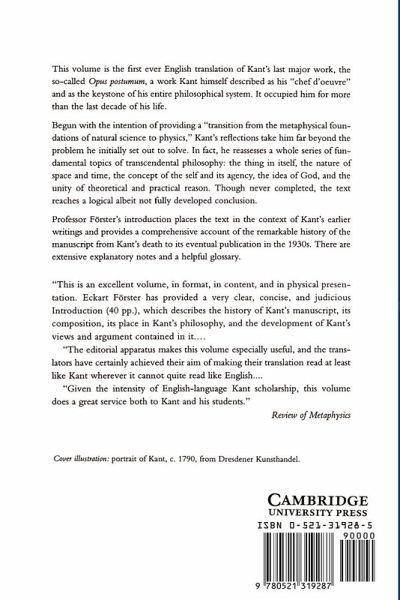 This volume is the first ever English translation of Kant's last major work, the so-called Opus Postumum, a work Kant himself described as his 'chef d'oeuvre' and as the keystone of his entire philosophical system. It occupied him for more than the last decade of his life.