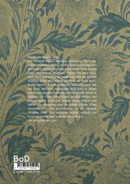Westberlin im Jahr 1974. Der Fotograf Fabian Amadeus Hartmann, erlebt mit seinen Freunden, Liebe, Leiden, Spaß und Trauer am Kurfürsten Damm der eingeschossenen Stadt Berlin. Seine amourösen Abenteuer führen Ihn über Paris nach Ibiza und weiter bis nach Rom. Wie ein Sog ins Aviditas. Kehrt aber immer wieder in die Stadt West-Berlin zurück. Durch politische Verwicklungen mit der Stasi und dem russischen KGB geht er illegal durch den eisernen Vorhang nach Russland. Sucht in Sibirien die Frau seine Chefs. In den Weiten des Landes lauert nicht nur Gefahr durch Wölfen und Bären. Die Menschen sind die größte Gefahr. Seine Situation wird fast aussichtslos, als die Mission verraten wird. Das russische Militär schließt die Grenzen und die Jagd nach ihn ist eröffnet. Ein Sittenbild der Zeit.
