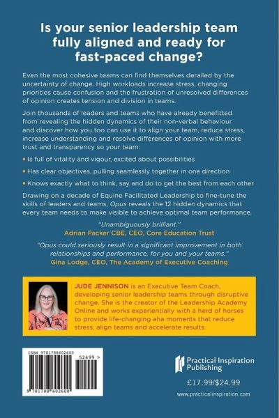 Is your senior leadership team fully aligned and ready for fast-paced change? Even the most cohesive teams can find themselves derailed by the uncertainty of change. High workloads increase stress, changing priorities cause confusion and the frustration of unresolved differences of opinion creates tension and division in teams. Join thousands of leaders and teams who have already benefitted from revealing the hidden dynamics of their non-verbal behaviour and discover how you too can use it to align your team, reduce stress, increase understanding and resolve differences of opinion with more trust and transparency so your team: * Is full of vitality and vigour, excited about possibilities * Has clear objectives, pulling seamlessly together in one direction * Knows exactly what to think, say and do to get the best from each other Drawing on a decade of Equine Facilitated Leadership to fine-tune the skills of leaders and teams, Opus reveals the 12 hidden dynamics that every team needs to make visible to achieve optimal team performance "Unambiguously brilliant." Adrian Packer CBE, CEO, Core Education Trust "Opus could seriously result in a significant improvement in both relationships and performance, for you and your teams." Gina Lodge, CEO, The Academy of Executive Coaching JUDE JENNISON is an Executive Team Coach, developing senior leadership teams through disruptive change. She is the creator of the Leadership Academy Online and works experientially with a herd of horses to provide life-changing aha moments that reduce stress, align teams and accelerate results.