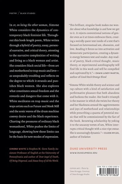 In or, on being the other woman, Simone White considers the dynamics of contemporary black feminist life. Throughout this book-length poem, White writes through a hybrid of poetry, essay, personal narrative, and critical theory, attesting to the narrative complexities of writing and living as a black woman and artist. She considers black social life-from art and motherhood to trap music and love-as unspeakably troubling and reflects on the degree to which it strands and punishes black women. She also explores what constitutes sexual freedom and the rewards and dangers that come with it. White meditates on trap music and the ways artists such as Future and Meek Mill and the sonic waves of the drum machine convey desire and the black experience. Charting the pressures of ordinary black womanhood, White pushes the limits of language, showing how those limits can be the basis for new modes of expression.