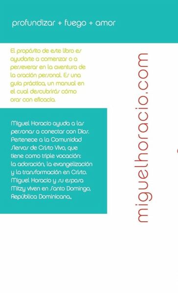 El propósito de este libro es ayudarte a comenzar o a perseverar en la aventura de la oración personal. Es una guía práctica, un manual en el cual descubrirás cómo orar con eficacia. Miguel Horacio ayuda a las personas a conectar con Dios. Pertenece a la Comunidad Siervos de Cristo Vivo, que tiene como triple vocación la adoración, la evangelización y la transformación en Cristo. Miguel Horacio y su esposa, Mitzy, viven en Santo Domingo, República Dominicana.