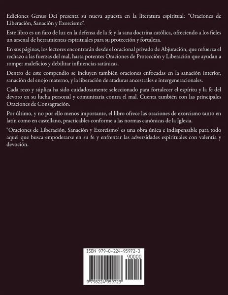 Ediciones Genus Dei presenta su nueva apuesta en la literatura espiritual: "Oraciones de Liberación, Sanación y Exorcismo". Este libro es un faro de luz en la defensa de la fe y la sana doctrina católica, ofreciendo a los fieles un arsenal de herramientas espirituales para su protección y fortaleza. En sus páginas, los lectores encontrarán desde el oracional privado de Abjuración, que refuerza el rechazo a las fuerzas del mal, hasta potentes Oraciones de Protección y Liberación que ayudan a romper maleficios y debilitar influencias satánicas. Dentro de este compendio se incluyen también oraciones enfocadas en la sanación interior, sanación del enojo materno, y la liberación de ataduras ancestrales e intergeneracionales. Cada rezo y súplica ha sido cuidadosamente seleccionado para fortalecer el espíritu y la fe del devoto en su lucha personal y comunitaria contra el mal. Cuenta también con las principales Oraciones de Consagración. Por último, y no por ello menos importante, el libro ofrece las oraciones de exorcismo tanto en latín como en castellano, practicables conforme a las normas canónicas de la Iglesia. "Oraciones de Liberación, Sanación y Exorcismo" es una obra única e indispensable para todo aquel que busca empoderarse en su fe y enfrentar las adversidades espirituales con valentía y devoción.
