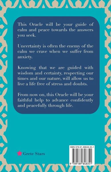 This Oracle will be your guide of calm and peace towards the answers you seek. Uncertainty is often the enemy of the calm we crave when we suffer from anxiety. Knowing that we are guided with wisdom and certainty, respecting our times and our nature, will allow us to live a life free of stress and doubts. From now on, this Oracle will be your faithful help to advance confidently and peacefully through life. A book to calm your anxiety. This Oracle will be an invaluable help for those uncertain times when we suffer from anxiety. Let yourself be guided by the wisdom of the Cosmos, magic and your intuition. The power is within us, we just need to know how to listen. This magical book will show you the answers to not deviate from your path. A wise path full of light. Ask a question within yourself and ask the book to enlighten you. Its advice and wisdom will surprise you and at the same time, will make you feel that you already knew everything and that you can be calm. Book, magic, Universe and mind, all are united, all know the answers. Welcome to a wise and full life. Inspired by the ancient wisdom of the I-ching and numerology. Ask a question within yourself and randomly choose a page from the book: the answer will be shown to you.
