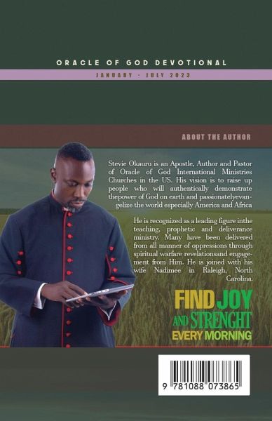 Oracle of God Devotional is a devotional filled with uniquely inspired treasures from heaven for every day of the year. Rev. Stevie Okauru decided to listen to God with pen in hand, writing down whatever he believed He was saying to him. Oracle of God devotional contains meaningful quotes along with insightful and thought-provoking prayers written by the author. It is designed to guide, encourage, and uplift you every day of the year. Every person has seeds of greatness planted within by the Creator. This devotional will help readers break out and break free so they can believe bigger, increase their productivity, improve their relationships, and accomplish their dreams. It is Rev. Stevie fervent prayers that our Savior may bless readers with His presence and His peace in ever deeper measure. Oracle of God Devotional is a devotional filled with uniquely inspired treasures from heaven for every day of the year. Rev. Stevie Okauru decided to listen to God with pen in hand, writing down whatever he believed He was saying to him. Oracle of God devotional contains meaningful quotes along with insightful and thought-provoking prayers written by the author. It is designed to guide, encourage, and uplift you every day of the year. Every person has seeds of greatness planted within by the Creator. This devotional will help readers break out and break free so they can believe bigger, increase their productivity, improve their relationships, and accomplish their dreams. It is Rev. Stevie fervent prayers that our Savior may bless readers with His presence and His peace in ever deeper measure.