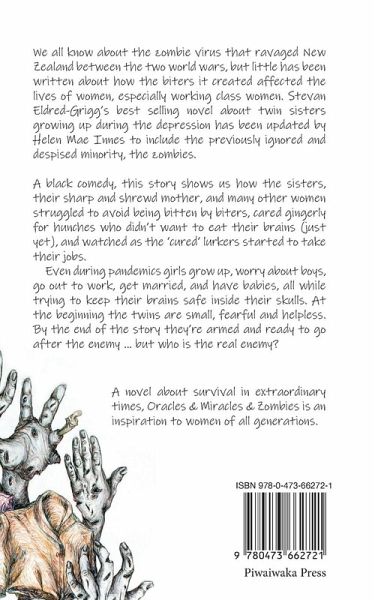 The best-selling novel about twin girls growing up in New Zealand is back - with zombies! We all know about the zombie virus that ravaged New Zealand between the two world wars, but little has been written about how the biters it created affected the lives of women, especially working-class women. Stevan Eldred-Grigg's best-selling novel about twin sisters growing up during the depression has been updated by Helen Mae Innes to include the previously ignored and despised minority, zombies. A black comedy, the story shows us how the sisters, their sharp and shrewd mother and many other women struggle to avoid being bitten by biters, care gingerly for hunches who don't want to eat their brains (yet) and watch as the 'cured' lurkers start to take their jobs. Even in times of pandemics girls still grow up, worry about boys, go out to work, get married and have babies, all while trying to keep their brains safe inside their skulls. At the beginning the twins are small, fearful and helpless. By the end of the story they're armed and ready to go after the enemy. But who is the real enemy? A novel about survival in extraordinary times, Oracles and Miracles and Zombies is an inspiration to women of all generations.