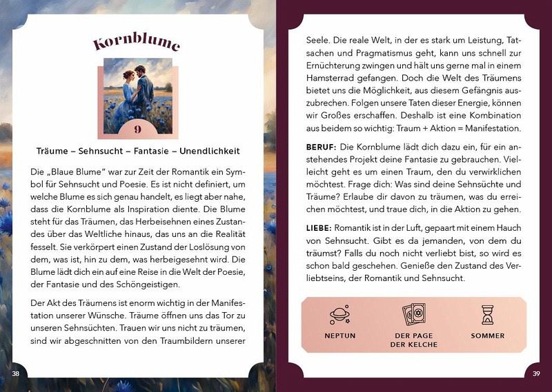 Mit Begleitbuch und Zusatzfunktionen: Jede Karte stellt einen Bezug zu Tarotdeutung und Astrologie her und lässt sich auch als Zeitkarte nutzen. Wie du die Karten am besten nutzt, erfährst du im umfassenden BegleitbuchZauberhafte Blumenkunst: 52 malerischin Szene gesetzte Blüten lassen die romantischen Kartenmotive erstrahlenHochwertige Kartenbox mit Folienprägung auf dem Cover und Karten mit edlem Goldschnitt