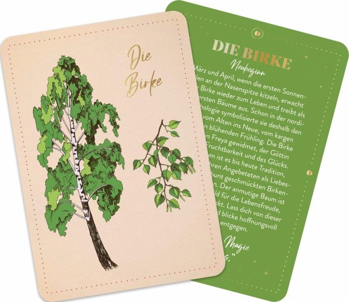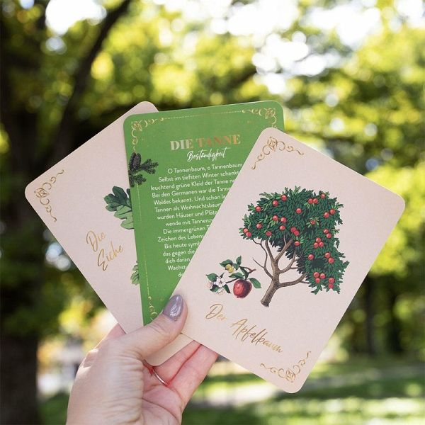 So funktioniert es: Nimm dir ein paar Minuten Zeit und mach es dir gemütlich. Mische die Orakelkarten, breite sie als Fächer vor dir aus und lass eine Hand über sie wandern. Wende dich mit einer konkreten Frage an die Karten oder lass dich einfach überraschen, was sie dir mitteilen möchten. Höre auf dein Bauchgefühl, bevor du eine Karte auswählst. Lass dich von der Botschaft deines Baumes inspirieren oder nutze sie als Motto für den Tag. Am Ende jeder Karte findet sich eine passende positive Affirmation.