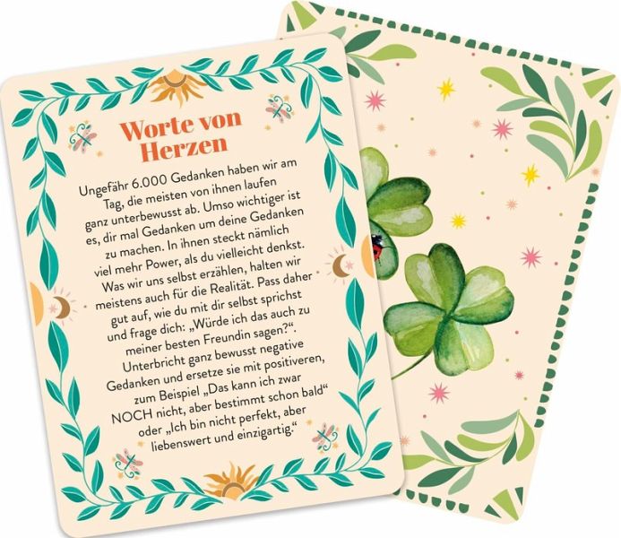 Ob als Geschenk für einen geliebten Menschen oder um deinem eigenen Leben einen positiven Anstoß zu geben - diese Karten sind der perfekte Begleiter auf deiner Reise zu einem erfüllteren und glücklicheren Alltag. Lass dich von der Weisheit des Orakels leiten und entdecke, wie viel Glück in jedem Tag steckt!