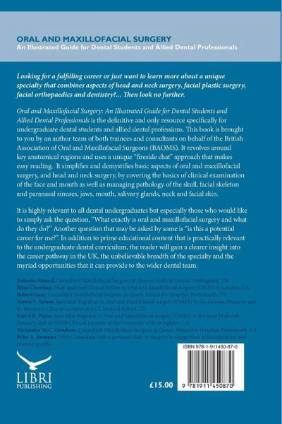 Oral and Maxillofacial Surgery: An Illustrated Guide for Dental Students and Allied Dental Professionals is the definitive and only resource specifically for undergraduate dental students and allied dental professions. This book is brought to you by an author team of both trainees and consultants on behalf of the British Association of Oral and Maxillofacial Surgeons (BAOMS). It revolves around key anatomical regions and uses a unique "fireside chat" approach that makes easy reading. It simplifies and demystifies basic aspects of oral and maxillofacial surgery, and head and neck surgery, by covering the basics of clinical examination of the face and mouth as well as managing pathology of the skull, facial skeleton and paranasal sinuses, jaws, mouth, salivary glands, neck and facial skin. It is highly relevant to all dental undergraduates but especially those who would like to simply ask the question, "What exactly is oral and maxillofacial surgery and what do they do?" Another question that may be asked by some is "is this a potential career for me?". In addition to prime educational content that is practically relevant to the undergraduate dental curriculum, the reader will gain a clearer insight into the career pathway in the UK, the unbelievable breadth of the specialty and the myriad opportunities that it can provide to the wider dental team.