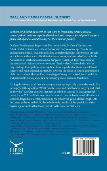 Oral and Maxillofacial Surgery: An Illustrated Guide for Dental Students and Allied Dental Professionals is the definitive and only resource specifically for undergraduate dental students and allied dental professions. This book is brought to you by an author team of both trainees and consultants on behalf of the British Association of Oral and Maxillofacial Surgeons (BAOMS). It revolves around key anatomical regions and uses a unique "fireside chat" approach that makes easy reading. It simplifies and demystifies basic aspects of oral and maxillofacial surgery, and head and neck surgery, by covering the basics of clinical examination of the face and mouth as well as managing pathology of the skull, facial skeleton and paranasal sinuses, jaws, mouth, salivary glands, neck and facial skin. It is highly relevant to all dental undergraduates but especially those who would like to simply ask the question, "What exactly is oral and maxillofacial surgery and what do they do?" Another question that may be asked by some is "is this a potential career for me?". In addition to prime educational content that is practically relevant to the undergraduate dental curriculum, the reader will gain a clearer insight into the career pathway in the UK, the unbelievable breadth of the specialty and the myriad opportunities that it can provide to the wider dental team.
