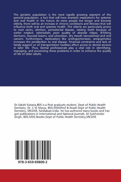 The geriatric population is the most rapidly growing segment of the general population, a fact that will have dramatic implications for systemic and oral health in the future. As more people live longer and become elderly, there will be an increase in chronic conditions and illnesses that will influence both oral and systemic health. The elderly are particularly prone to root caries, attrition, periodontal disease, missing teeth because of earlier neglect, edentulism, poor quality of alveolar ridges, ill-fitting dentures, mucosal lesions, oral ulceration, dry mouth (xerostomia) and oral cancers. Furthermore, medications like antihypertensives, antipsychotics increases the predilection to oral disease. Financial constraints and lack of family support or of transportation facilities affect access to dental services in later life. Thus, Dental professionals play a vital role in identifying, managing, and preventing these problems in order to enhance the quality of life of older adults.