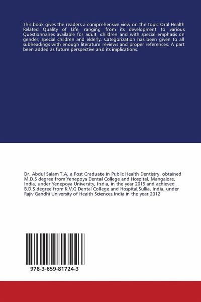 This book gives the readers a comprehensive view on the topic Oral Health Related Quality of Life, ranging from its development to various Questionnaires available for adult, children and with special emphasis on gender, special children and elderly. Categorization has been given to all subheadings with enough literature reviews and proper references. A part been added as future perspective and its implications.