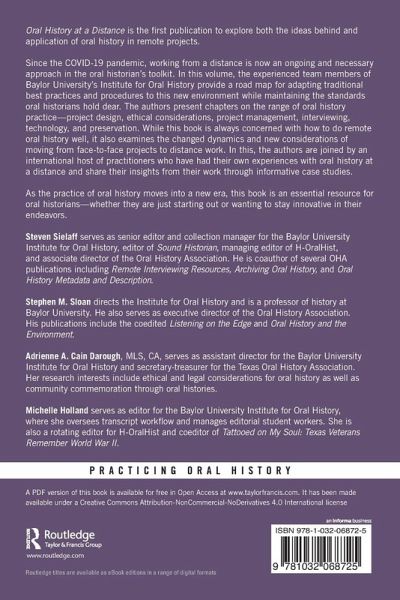 Since the COVID-19 pandemic, working from a distance is now an ongoing and necessary approach in the oral historian's toolkit. In this volume, the experienced team members of Baylor University's Institute for Oral History provide a road map for adapting traditional best practices and procedures to this new environment while maintaining the standards oral historians hold dear. The authors present chapters on the range of oral history practice-project design, ethical considerations, project management, interviewing, technology, and preservation. While this book is always concerned with how to do remote oral history well, it also examines the changed dynamics and new considerations of moving from face-to-face projects to distance work. In this, the authors are joined by an international host of practitioners who have had their own experiences with oral history at a distance and share their insights from their work through informative case studies.
