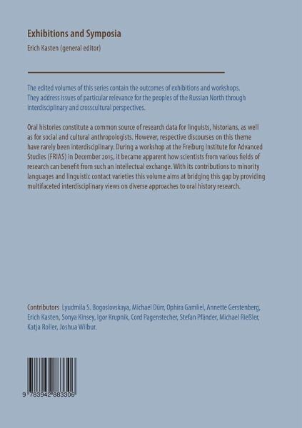 Oral histories constitute a common source of research data for linguists, historians, as well as for social and cultural anthropologists. However, respective discourses on this theme have rarely been interdisciplinary. During a workshop at the Freiburg Institute for Advanced Studies (FRIAS) in December 2015, it became apparent how scientists from various fields of research can benefit from such an intellectual exchange. With its contributions to minority languages and linguistic contact varieties this volume aims at bridging this gap by providing multifaceted interdisciplinary views on diverse approaches to oral history research.This volume contains contributions by Lyudmila S. Bogoslovskaya, Michael Duerr, Ophira Gamliel, Annette Gerstenberg, Erich Kasten, Sonya Kinsey, Igor Krupnik, Cord Pagenstecher, Stefan Pfänder, Michael Riessler, Katja Roller, and Joshua Wilbur.