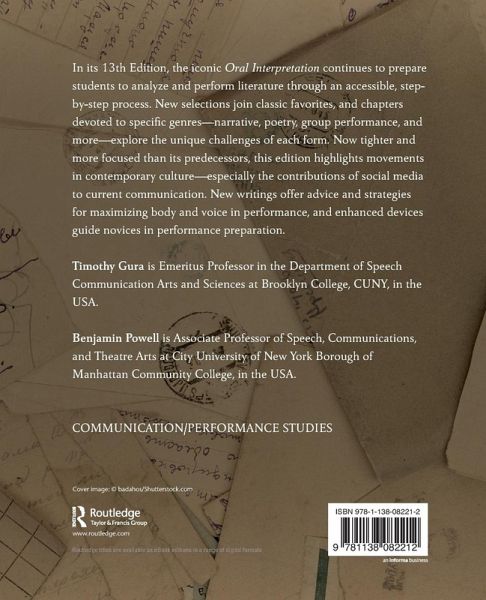 In its 13th Edition, the iconic Oral Interpretation continues to prepare students to analyze and perform literature through an accessible, step-by-step process. New selections join classic favorites, and chapters devoted to specific genres-narrative, poetry, group performance, and more-explore the unique challenges of each form. Now tighter and more focused than its predecessors, this edition highlights movements in contemporary culture-especially the contributions of social media to current communication. New writings offer advice and strategies for maximizing body and voice in performance, and enhanced devices guide novices in performance preparation.