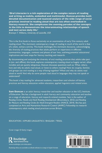 'Oral Literacies is a rich exploration of the complex nature of reading and writing as mobile, embodied, and multimodal. Duncan provides both detailed documentation and nuanced analysis of the wide range of social practices involved in reading aloud that are too often overlooked in literacy research. She complicates the seeming paradox of the concepts in the title to demonstrate the interanimating relationships of speech and text across daily life.'