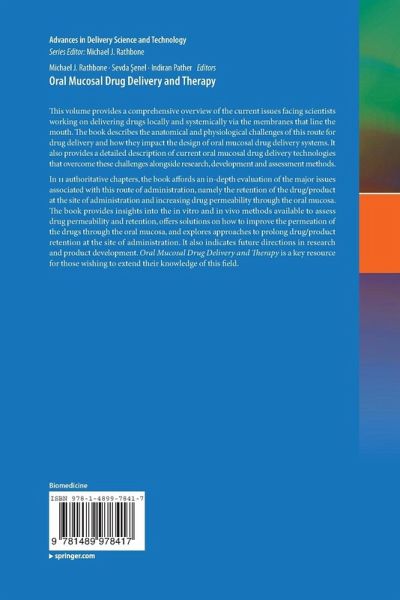Michael J. Rathbone is Founder and Managing Director of ULTI Pharmaceuticals, a veterinary pharmaceutical company located in New Zealand. He was formerly Professor of Pharmaceutical Technology and Dean, School of Pharmacy, International Medical University, Kuala Lumpur, Malaysia. Prior to this, he was Associate Professor of Pharmaceutics, School of Pharmacy, Griffith University, Australia, and the Director of Research and General Manager of InterAg, where he spearheaded the companies veterinary controlled drug delivery research and directed their national and global collaborative research activities. Dr. Rathbone obtained his PhD in Pharmaceutics from the University of Aston, Birmingham, UK. He is a Fellow of the Controlled Release Society and has edited eight books in the area of modified release drug delivery and 10 special theme issues of journals.Sevda Senel is Professor of Pharmaceutical Technology at Hacettepe University, Faculty of Pharmacy, Turkey. She is internationally recognized for her contribution to the areas of mucosal drug and vaccine delivery, veterinary drug delivery and dental drug delivery. Prof. Senel has been the recipient of many national and international grants and has published more than 150 communications to scientific meetings, papers in refereed journals, book chapters and books. She has served as the Editor-in Chief of the FABAD Journal of Pharmaceutical Sciences and currently serves on the Editorial Boards of the Journal of Drug Delivery Science and Technology, Pharmaceutical Technology and Development, and the Polish Chitin Society Journal, Progress in the Chemistry and Application of Chitin and its Derivatives. She served as the President of the European Chitin Society for two terms and currently sits on several committees of the Controlled Release Society and on two advisory committees at The Drug and Medical Device Agency of Turkey. Professor Senel has received many honors, awards, and fellowships, and most notably has been honored with the Distinguished Scientist Award by the Academy of Science of the Turkish Pharmacists Association and the Hacettepe University Science Award.Indiran Pather serves as Director of Research and Professor of Pharmaceutics at the California Northstate University College of Pharmacy (CNUCOP). After completing the B. Pharm. degree, he practiced as a pharmacist in South Africa. He subsequently completed the M. Pharm. and D. Pharm. degrees in Pharmaceutics. He taught in South Africa before joining the University of Missouri as a Research Assistant Professor. Since then, he has worked in the industry and held positions of increasing responsibility up to Director of Pharmaceutical Sciences. At CNUCOP, he teaches courses in Compounding and Biopharmaceutics and Drug Delivery. His research has involved analytical chemistry, novel drug delivery systems, and the formulation of cosmetics, pharmaceuticals, and animal health products. Prof. Pather holds 17 U.S. patents and has published 31 patent applications. He is a reviewer for several international pharmaceutical journals. His present research interests involve the formulation of novel drug delivery systems (especially oral transmucosal), finding new uses for established drugs, and in natural products. He currently serves as a consultant to pharmaceutical companies.