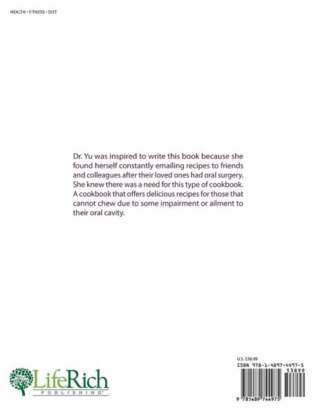 Dr. Yu was inspired to write this book because she found herself constantly emailing recipes to friends and collogues after their loved ones had oral surgery. She knew there was a need for this type of cookbook. A cookbook that offers delicious recipes for those that cannot chew due to some impairment or ailment to their oral cavity.