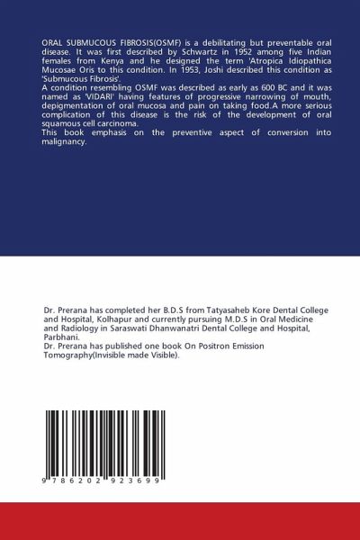 ORAL SUBMUCOUS FIBROSIS(OSMF) is a debilitating but preventable oral disease. It was first described by Schwartz in 1952 among five Indian females from Kenya and he designed the term 'Atropica Idiopathica Mucosae Oris to this condition. In 1953, Joshi described this condition as 'Submucous Fibrosis'.A condition resembling OSMF was described as early as 600 BC and it was named as 'VIDARI' having features of progressive narrowing of mouth, depigmentation of oral mucosa and pain on taking food.A more serious complication of this disease is the risk of the development of oral squamous cell carcinoma.This book emphasis on the preventive aspect of conversion into malignancy.