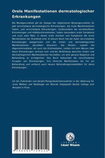 Die Mundgesundheit gilt als Spiegel der allgemeinen Körpergesundheit. Es gibt verschiedene dermatologische Erkrankungen, die orale Manifestationen haben, und verschiedene Erkrankungen, insbesondere die vesikobullösen Erkrankungen und Infektionskrankheiten, haben besondere orale Symptome und auch viele Fälle, in denen orale Zeichen und Symptome die erste Manifestation der Krankheit sind. In diesem Buch hat der Autor verschiedene Erkrankungen kategorisiert und die oralen und dermatologischen Manifestationen derselben diskutiert. Die Kliniker, sowohl die Allgemeinmediziner als auch die Oralmediziner, sollten mit dem Wissen über diese Erkrankungen vertraut sein und die Verbindung zwischen oralen und dermatologischen Manifestationen herstellen, um eine genaue Diagnose und Behandlung zu ermöglichen. Das Buch beleuchtet die verschiedenen Gruppen von Erkrankungen, ihre klinische Manifestation bis hin zur Behandlung und umfasst auch neuere Behandlungsmodalitäten für diese Erkrankungen.