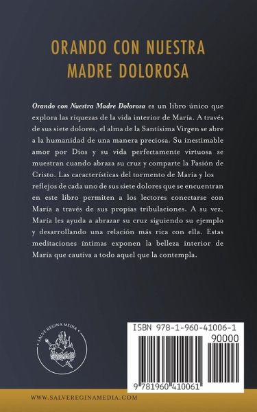 Orando con Nuestra Madre Dolorosa es un libro único que explora las riquezas de la vida interior de María. A través de sus siete dolores, el alma de la Santísima Virgen se abre a la humanidad de una manera preciosa. Su inestimable amor por Dios y su vida perfectamente virtuosa se muestran cuando abraza su cruz y comparte la Pasión de Cristo. Las características del tormento de María y los reflejos de cada uno de sus siete dolores que se encuentran en este libro permiten a los lectores conectarse con María a través de sus propias tribulaciones. A su vez, María les ayuda a abrazar su cruz siguiendo su ejemplo y desarrollando una relación más rica con ella. Estas meditaciones íntimas exponen la belleza interior de María que cautiva a todo aquel que la contempla.