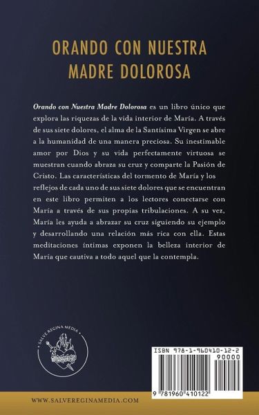 Orando con Nuestra Madre Dolorosa es un libro único que explora las riquezas de la vida interior de María. A través de sus siete dolores, el alma de la Santísima Virgen se abre a la humanidad de una manera preciosa. Su inestimable amor por Dios y su vida perfectamente virtuosa se muestran cuando abraza su cruz y comparte la Pasión de Cristo. Las características del tormento de María y los reflejos de cada uno de sus siete dolores que se encuentran en este libro permiten a los lectores conectarse con María a través de sus propias tribulaciones. A su vez, María les ayuda a abrazar su cruz siguiendo su ejemplo y desarrollando una relación más rica con ella. Estas meditaciones íntimas exponen la belleza interior de María que cautiva a todo aquel que la contempla.