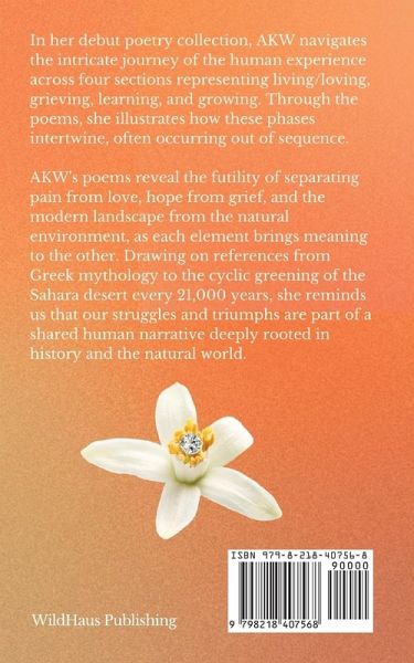 In her debut poetry collection, AKW navigates the intricate journey of the human experience across four sections representing living/loving, grieving, learning, and growing. Through the poems, she illustrates how these phases intertwine, often occurring out of sequence. AKW's poems reveal the futility of separating pain from love, hope from grief, and the modern landscape from the natural environment, as each element brings meaning to the other. Drawing on references from Greek mythology to the cyclic greening of the Sahara desert every 21,000 years, she reminds us that our struggles and triumphs are part of a shared human narrative deeply rooted in history and the natural world. "The Sahara Desert becomes green every 21,000 years and I decorate my teeth with gems don't you dare tell me it's not a miracle to exist here and now."