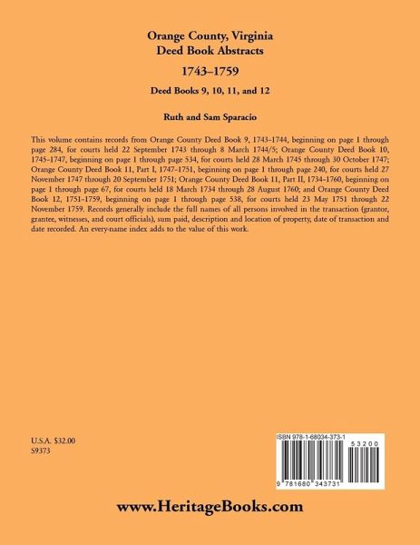 This volume contains records from Orange County Deed Book 9, 1743-1744, beginning on page 1 through page 284, for courts held 22 September 1743 through 8 March 1744/5; Orange County Deed Book 10, 1745-1747, beginning on page 1 through page 534, for courts held 28 March 1745 through 30 October 1747; Orange County Deed Book 11, Part I, 1747-1751, beginning on page 1 through page 240, for courts held 27 November 1747 through 20 September 1751; Orange County Deed Book 11, Part II, 1734-1760, beginning on page 1 through page 67, for courts held 18 March 1734 through 28 August 1760; and Orange County Deed Book 12, 1751-1759, beginning on page 1 through page 538, for courts held 23 May 1751 through 22 November 1759. Records generally include the full names of all persons involved in the transaction (grantor, grantee, witnesses, and court officials), sum paid, description and location of property, date of transaction and date recorded. An every-name index adds to the value of this work. (1985), 2016, 8¿x11, paper, , 204 pp