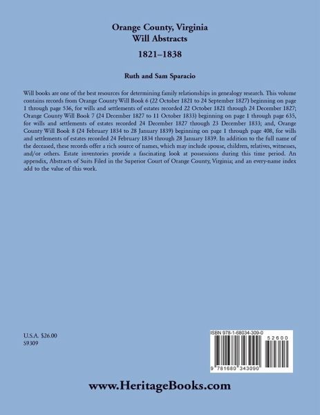 Will books are one of the best resources for determining family relationships in genealogy research. This volume contains records from Orange County Will Book 6 (22 October 1821 to 24 September 1827) beginning on page 1 through page 536, for wills and settlements of estates recorded 22 October 1821 through 24 December 1827; Orange County Will Book 7 (24 December 1827 to 11 October 1833) beginning on page 1 through page 635, for wills and settlements of estates recorded 24 December 1827 through 23 December 1833; and, Orange County Will Book 8 (24 February 1834 to 28 January 1839) beginning on page 1 through page 408, for wills and settlements of estates recorded 24 February 1834 through 28 January 1839. In addition to the full name of the deceased, these records offer a rich source of names, which may include spouse, children, relatives, witnesses, and/or others. Estate inventories provide a fascinating look at possessions during this time period. An appendix, Abstracts of Suits Filed in the Superior Court of Orange County, Virginia; and an every-name index add to the value of this work.