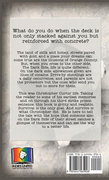 The land of milk and honey, streets paved with gold, and a place your dreams can come true are the illusions of Orange County. But, when you cross to the other side, The Dark Side, life is quite different. On the dark side, allowances given are lines of cocaine. Drive-by shootings are a daily occurrence, and parents are not the protectors but the ones who send you out to score for them. This was Christopher Curtis' life. Taking the reader to some of his earliest memories and on through his third strike prison sentence, this book is gritty and realistic. All the systems in place to help the kids who fall through the cracks failed Christopher. As he matures, the addiction, crimes and lifestyle accelerate and degrade. The book contains the despair that, at times, Christopher did not even realize was part of his day. The ups and downs of drugs. The using and selling, the getting away with and being punished for his crimes. The community that revolves around an addict are all exposed in plain language, the original written by Christopher on a typewriter. What do you do when the deck is not only stacked against you but reinforced with concrete? Survival is the only goal. And survive is what Christopher did. He is here to tell the tale with the hope that someone also on the Dark Side of their street catches a glimpse of themselves and can see the way to a better life.