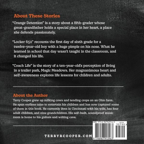 Orange Detention is a trio of middle-school stories about real-life issues they face today. The first story, Orange Detention, is a story about a fifth grader whose great-grandfather holds a special place in her heart, a place she defends passionately. Locker 652 recounts the first day of sixth grade for a twelve-year-old boy with a huge pimple on his nose. What he learned in school that day wasn't taught in the classroom and it changed his life. Coach Life is the story of a ten-year-old's perception of living in a trailer park, Magic Meadows. Her magnanimous heart and self-awareness explore life lessons for children and adults.
