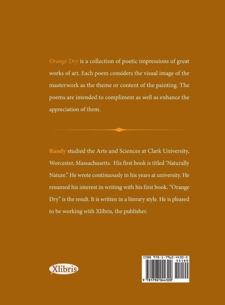 Orange Dry is a collection of poetic impressions of great works of art. Each poem considers the visual image of the masterwork as the theme or content of the painting. The poems are intended to compliment as well as enhance the appreciation of them.