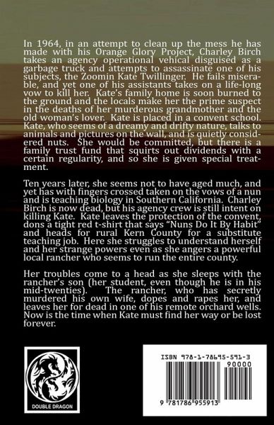 In 1964, in an attempt to clean up the mess he has made with his Orange Glory Project, Charley Birch takes an agency operational vehical disguised as a garbage truck and attempts to assassinate one of his subjects, the Zoomin Kate Twillinger. He fails miserable, and yet one of his assistants takes on a life-long vow to kill her. Kate's family home is soon burned to the ground and the locals make her the prime suspect in the deaths of her murderous grandmother and the old woman's lover. Kate is placed in a convent school. Kate, who seems of a dreamy and drifty nature, talks to animals and pictures on the wall, and is quietly considered nuts. She would be committed, but there is a family trust fund that squirts out dividends with a certain regularity, and so she is given special treatment. Ten years later, she seems not to have aged much, and yet has with fingers crossed taken on the vows of a nun and is teaching biology in Southern California. Charley Birch is now dead, but his agency crew is still intent on killing Kate. Kate leaves the protection of the convent, dons a tight red t-shirt that says "Nuns Do It By Habit" and heads for rural Kern County for a substitute teaching job. Here she struggles to understand herself and her strange powers even as she angers a powerful local rancher who seems to run the entire county. Her troubles come to a head as she sleeps with the rancher's son (her student, even though he is in his mid-twenties). The rancher, who has secretly murdered his own wife, dopes and rapes her, and leaves her for dead in one of his remote orchard wells. Now is the time when Kate must find her way or be lost forever.